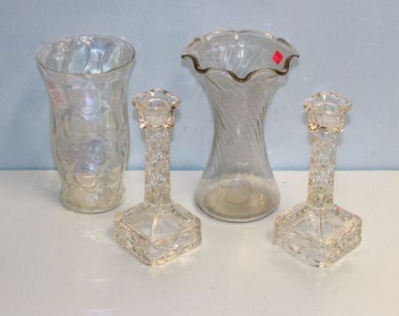 22093 Two Glass Vases 8"h., and Pair of Glass Candlesticks 7"h.