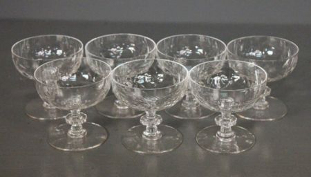 22157 Set of Seven Cut Glass Champagne Glasses Description: Set of Seven Cut Glass Champagne Glasses; 3" h.
