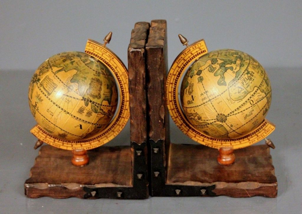 22159 Vintage Globe Bookends Description: Vintage Globe Bookends; 8" h, 6" w.