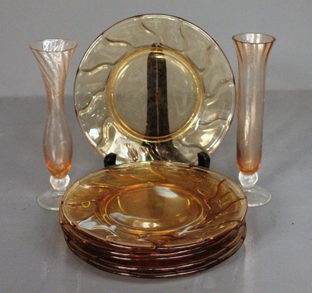 Group of Amber Colored Depression Glass Salad Plates and Two Bud Vases Description: Group of Amber Colored Depression Glass Salad Plates and Two Bud Vases Group of Amber Colored Depression Glass Salad Plates and Two Bud Vases Description: Group of Amber Colored Depression Glass Salad Plates and Two Bud Vases