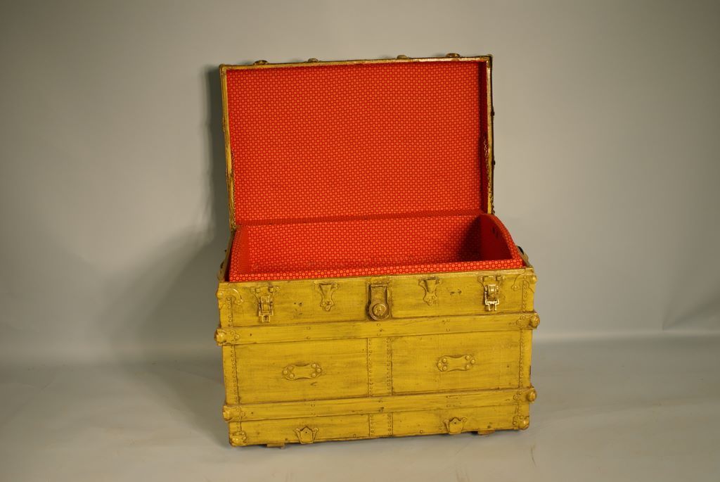Trunk with Original Tray and new Lining, the outside is antiqued in a nice yellow finish. Excellent condition, first quarter 20th Century. W. 34", d. 20-1/2", h. 24" Trunk with Original Tray and new Lining, the outside is antiqued in a nice yellow finish. Excellent condition, first quarter 20th Century. W. 34", d. 20-1/2", h. 24"