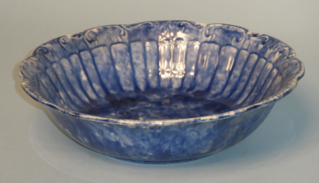 American Blue and White Sponge-Bordered and Banded Pottery Kitchen Bowl, last quarter 19th Century. Spongeware designs were applied to the ceramics by daubing the color on with a sponge or cloth. dia. 8-1/2", h. 2-1/4" American Blue and White Sponge-Bordered and Banded Pottery Kitchen Bowl, last quarter 19th Century. Spongeware designs were applied to the ceramics by daubing the color on with a sponge or cloth. dia. 8-1/2", h. 2-1/4"
