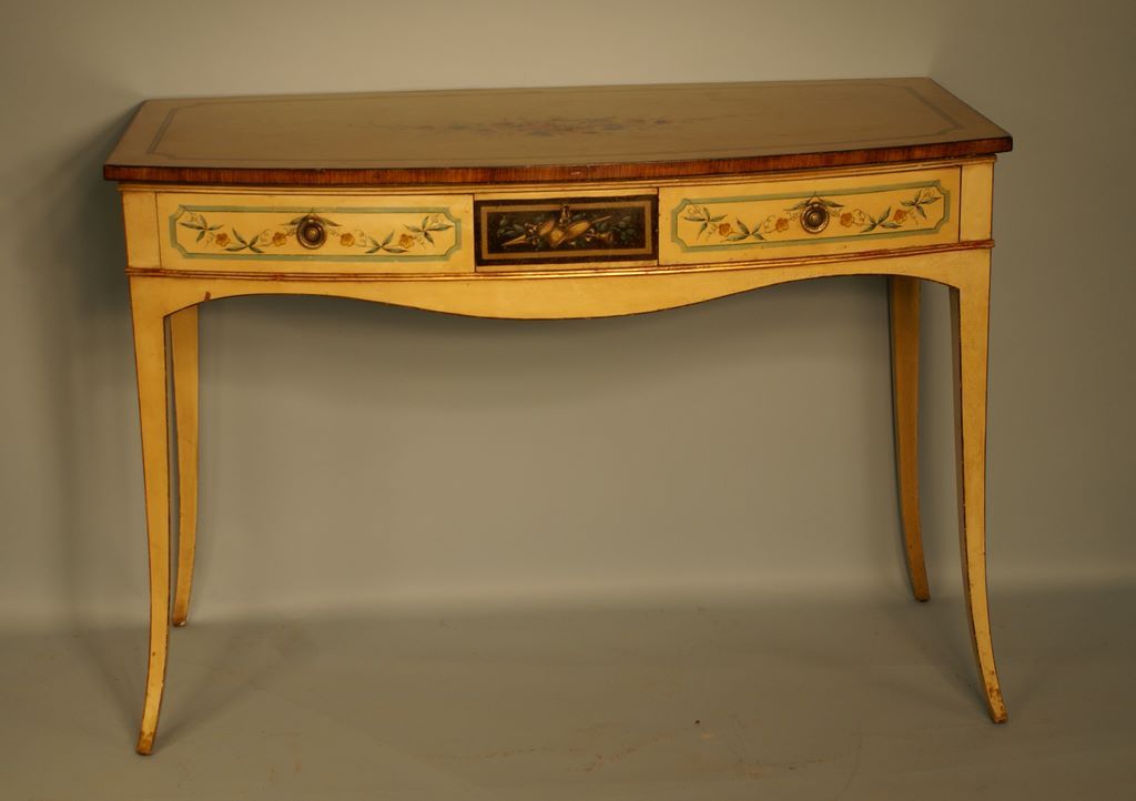 French Ladies Writing Desk hand painted with shapely legs and design in top, last quarter 19th Century. w. 44-7/8", d. 22-1/2", h. 31-1/2" French Ladies Writing Desk hand painted with shapely legs and design in top, last quarter 19th Century. w. 44-7/8", d. 22-1/2", h. 31-1/2"