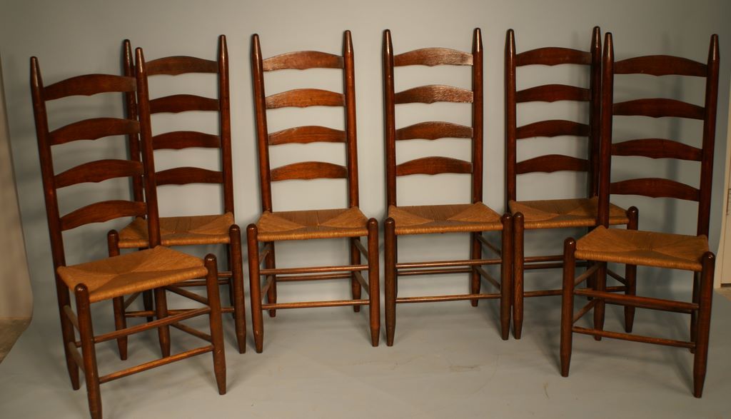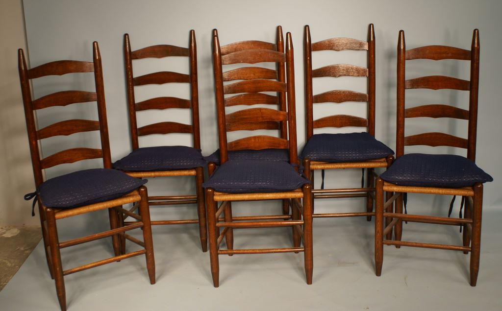 Set of 6 Ladder Back Chairs with Cane Bottom Seats, second quarter 20th Century. w. 18", h. 42-1/2" Set of 6 Ladder Back Chairs with Cane Bottom Seats, second quarter 20th Century. w. 18", h. 42-1/2"