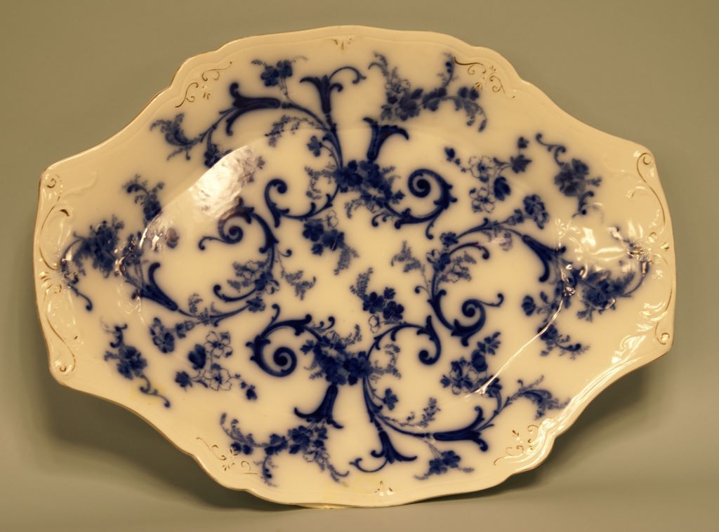 "Flow Blue" Platters, first quarter 20th century, an attractive Grindley's, Staffordshire, "Flow Blue" oval platter in floral decor, with traces of the period parcel gilding, w. 17-3/8" x 13" "Flow Blue" Platters, first quarter 20th century, an attractive Grindley's, Staffordshire, "Flow Blue" oval platter in floral decor, with traces of the period parcel gilding, w. 17-3/8" x 13"