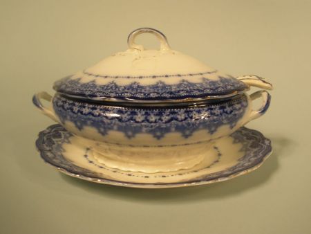 Flow Blue Gravy with Underplate and Ladle. W, Victoria, W H Crinoley and C England. -h. 5" x w. 9". No apparent chips, discoloration or flaws. Flow Blue Gravy with Underplate and Ladle. W, Victoria, W H Crinoley and C England. -h. 5" x w. 9". No apparent chips, discoloration or flaws.