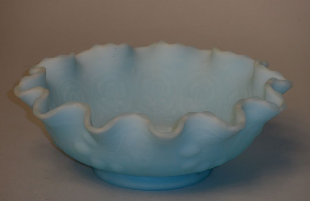 Opaque blue Fenton bowl with fluted edge design. Dia. 8", h. 3" Opaque blue Fenton bowl with fluted edge design. Dia. 8", h. 3"
