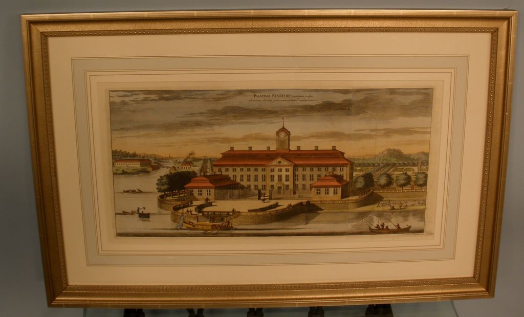 Eric Dahlberg (Swedish, 1625-1703) "Estates and Gardens", hand-colored copper engraving, Stockholm, 1696-1704. Glazed, matted and presented in silvered wood frame. w. 25-1/4", h. 17-1/4" Eric Dahlberg (Swedish, 1625-1703) "Estates and Gardens", hand-colored copper engraving, Stockholm, 1696-1704. Glazed, matted and presented in silvered wood frame. w. 25-1/4", h. 17-1/4"