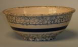 American Blue and White Sponge-Bordered and Banded Pottery Kitchen Bowl. Dia. 10-1/2", h. 4" American Blue and White Sponge-Bordered and Banded Pottery Kitchen Bowl. Dia. 10-1/2", h. 4"
