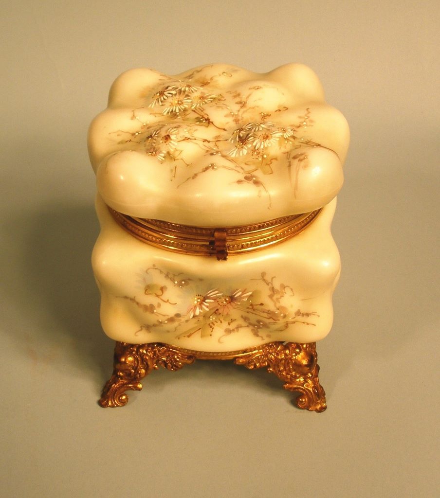 C. F. Monroe Gilt-Brass-Mounted Wave Crest Glass Puffy, or "Egg Crate", Footed Dresser Box, fourth quarter 19th century, signed on the base in red, h. 6", w. 5", d. 5". For a similar Wave Crest box, see W. R. Cohen, Wave Crest, The Glass of C. F. Monroe, C. F. Monroe Gilt-Brass-Mounted Wave Crest Glass Puffy, or "Egg Crate", Footed Dresser Box, fourth quarter 19th century, signed on the base in red, h. 6", w. 5", d. 5". For a similar Wave Crest box, see W. R. Cohen, Wave Crest, The Glass of C. F. Monroe,