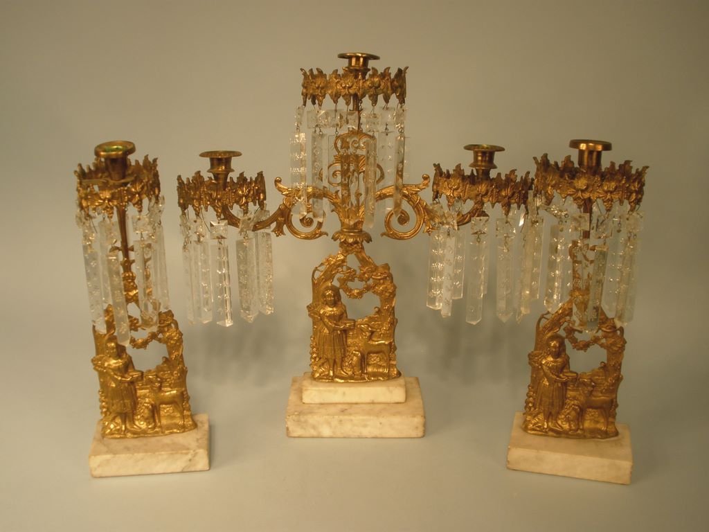 Good Three-Piece American Gilt-Brass and White Marble Mantel Garniture, third quarter 19th century, in "Colonial Soldier and Grandchild" decor, the set composed of a central three-light girandole, h. 17-3/4", and a pair of flanking single-light girandole Good Three-Piece American Gilt-Brass and White Marble Mantel Garniture, third quarter 19th century, in "Colonial Soldier and Grandchild" decor, the set composed of a central three-light girandole, h. 17-3/4", and a pair of flanking single-light girandole