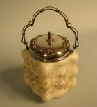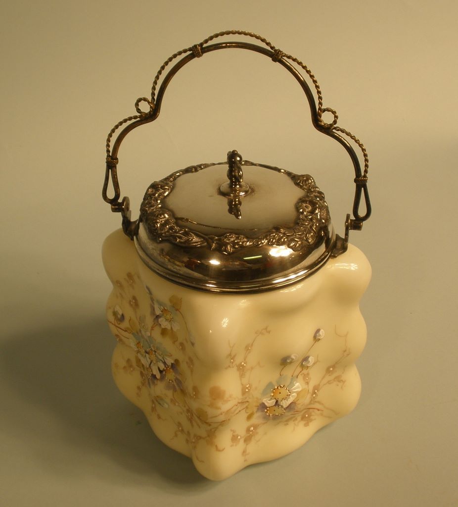 Good C. F. Monroe Silverplate-Mounted and -Covered Puffy Wave Crest Opal Glass Cracker Jar, fourth quarter 19th century, of square section in floral d Good C. F. Monroe Silverplate-Mounted and -Covered Puffy Wave Crest Opal Glass Cracker Jar, fourth quarter 19th century, of square section in floral d