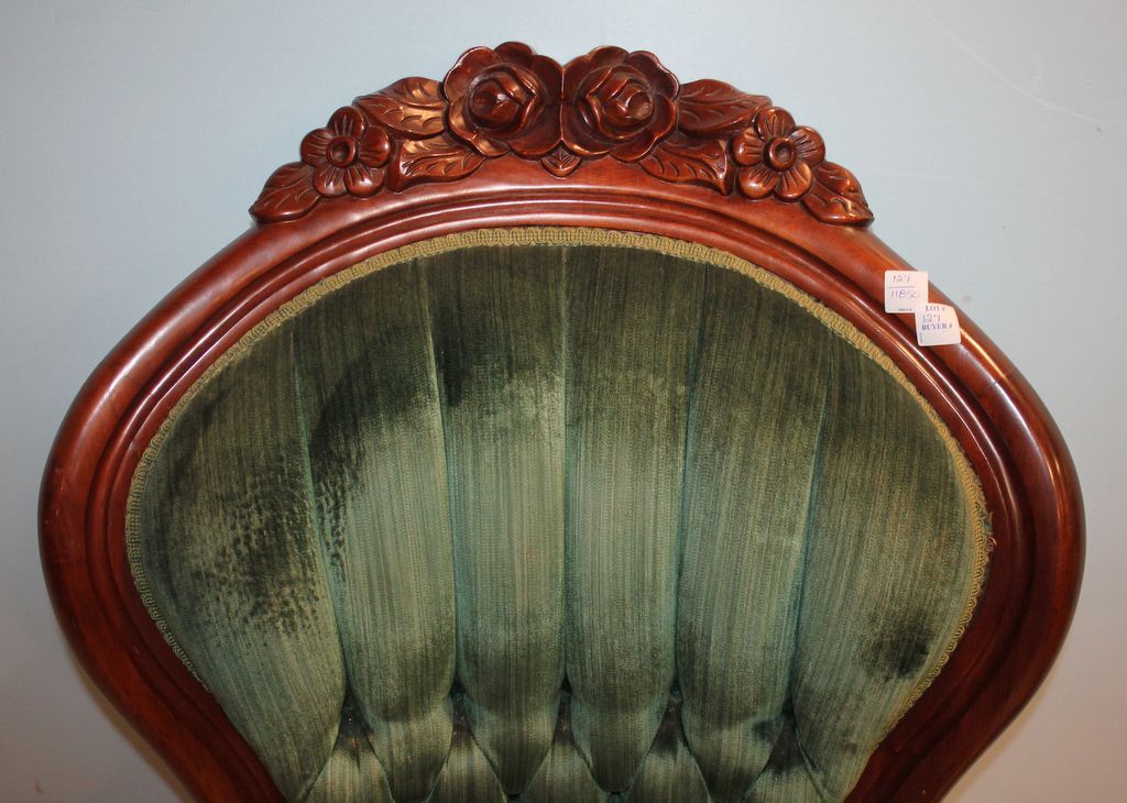 Victorian style rose carved gentleman's chair covered in green velvet, matches lot 0125 and 0126; 24"w., 21"d., 41"h. Victorian style rose carved gentleman's chair covered in green velvet, matches lot 0125 and 0126; 24"w., 21"d., 41"h.