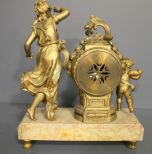 Gold painted Spelter Figurine mantle clock on marble base, 12"w., 15"h. Gold painted Spelter Figurine mantle clock on marble base, 12"w., 15"h.