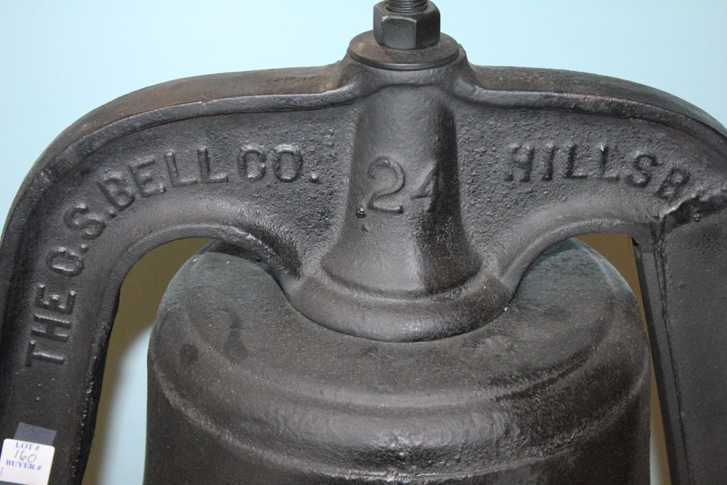 24" yoke cast iron plantation bell on stand, marked The O.S. Bell Co. Hillsboro, has clapper. 24" yoke cast iron plantation bell on stand, marked The O.S. Bell Co. Hillsboro, has clapper.