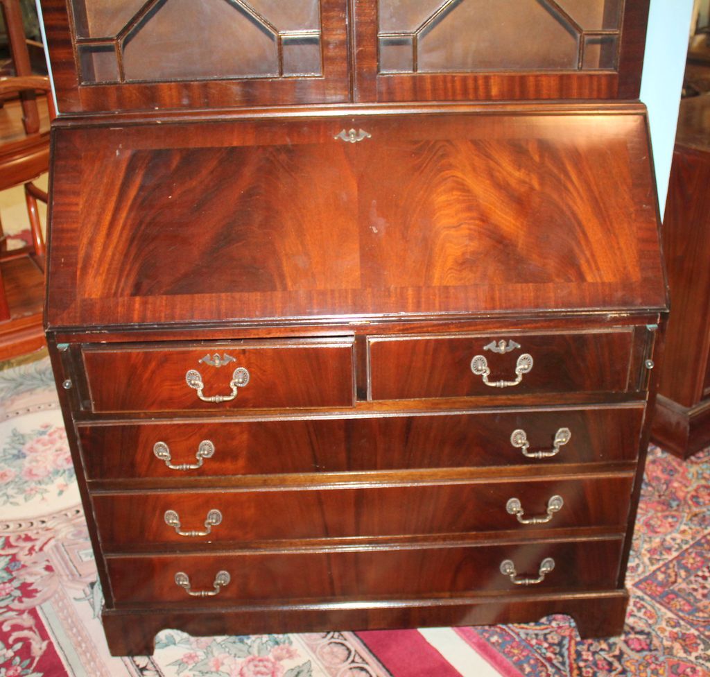 Fall front Chippendale style desk with bookcase top, five drawers, bracket feet, top has two glass doors with design and dental molding, 39"w., 17"d., 75"h. Fall front Chippendale style desk with bookcase top, five drawers, bracket feet, top has two glass doors with design and dental molding, 39"w., 17"d., 75"h.