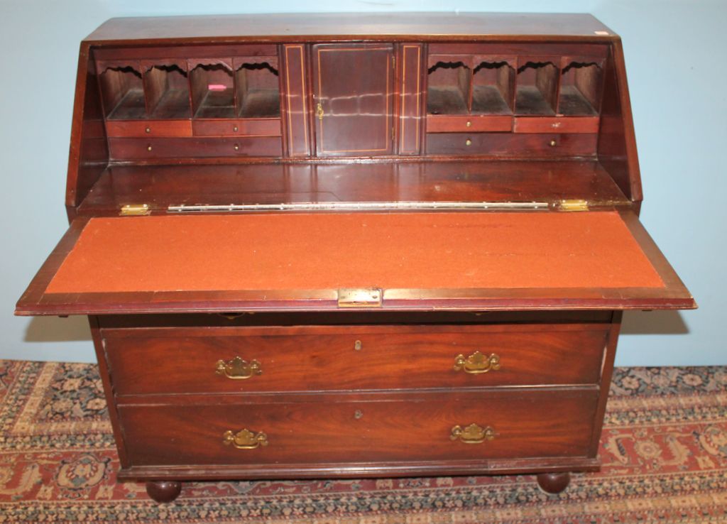 Large English 1800s fall front desk with fitted interior on bun feet, 46"w., 21"d., 44"h. Large English 1800s fall front desk with fitted interior on bun feet, 46"w., 21"d., 44"h.