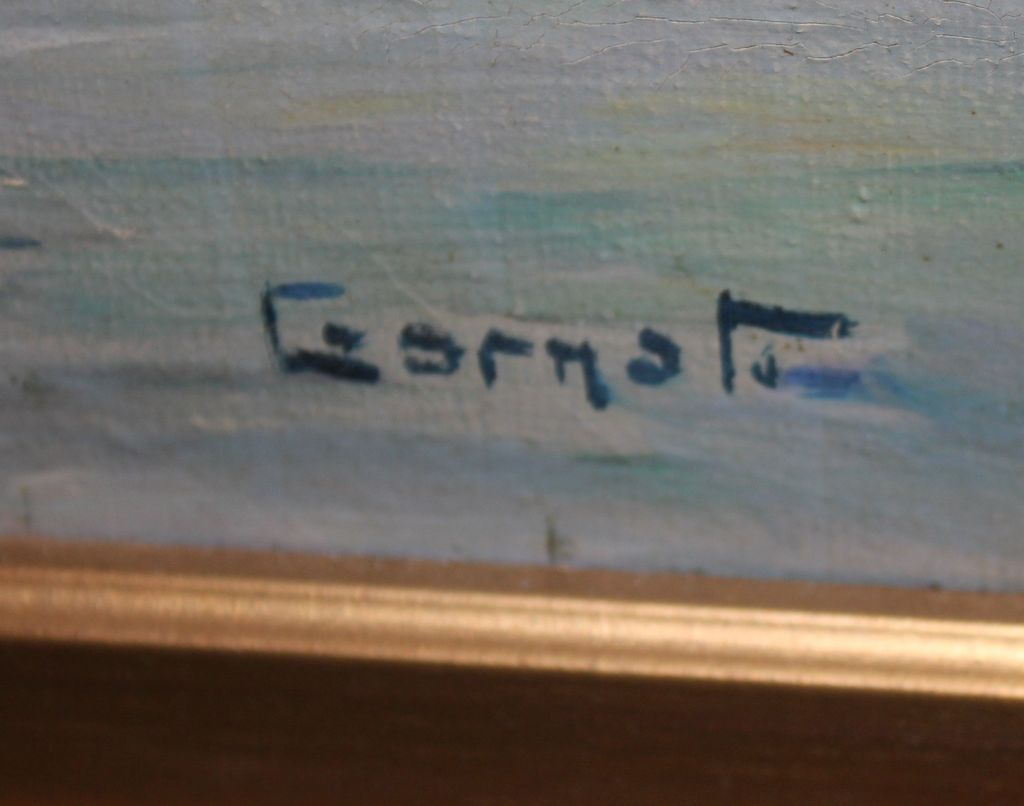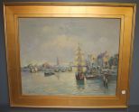 Late 19th Century or Early 20th Century Oil Painting of Harbor Scene Depicting Boats, Tredgine, and Background of Buildings. Signed Lower Left, 38"w., 32"h. Late 19th Century or Early 20th Century Oil Painting of Harbor Scene Depicting Boats, Tredgine, and Background of Buildings. Signed Lower Left, 38"w., 32"h.