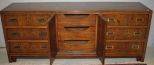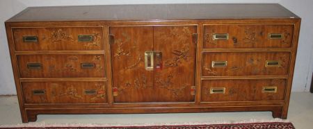 Chinese Style Bureau, bureau has two center doors with slide out interior drawers, flanked on each side by three drawers, matches lot #307 and #309; 77"w., 19"d., 30"h. Chinese Style Bureau, bureau has two center doors with slide out interior drawers, flanked on each side by three drawers, matches lot #307 and #309; 77"w., 19"d., 30"h.