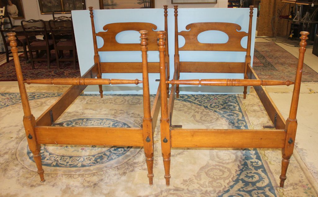 Pair of early American maple twin poser beds, 50"h. Pair of early American maple twin poser beds, 50"h.