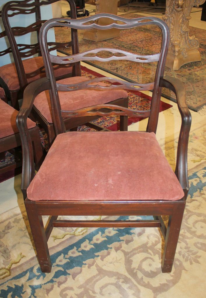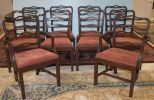 Set of ten straight leg, ladder back mahogany dining chairs, consisting of two arms, eight sides, 21"w., 16"d., 37"h. Set of ten straight leg, ladder back mahogany dining chairs, consisting of two arms, eight sides, 21"w., 16"d., 37"h.