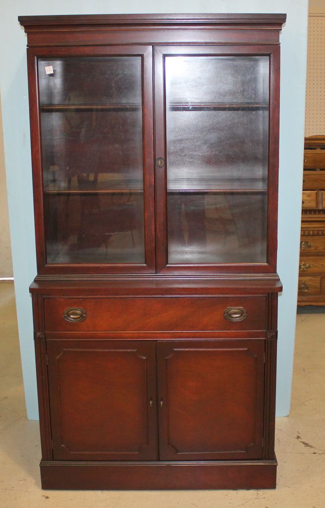 Mahogany two door over one drawer over two door china cabinet; 36" w., 70" h., 18" d. Mahogany two door over one drawer over two door china cabinet; 36" w., 70" h., 18" d.