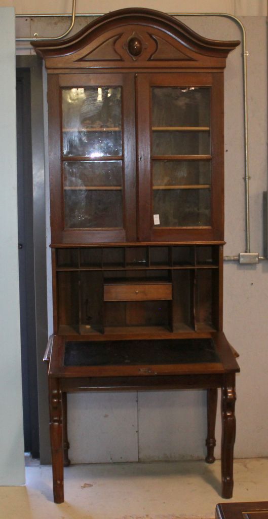 Walnut Victorian fall Front secretary with upper section having two glass doors, bonnet top, fitted interior and bottom section has drawer with curved Victorian legs 37"w., 22"d., 95"h. Walnut Victorian fall Front secretary with upper section having two glass doors, bonnet top, fitted interior and bottom section has drawer with curved Victorian legs 37"w., 22"d., 95"h.