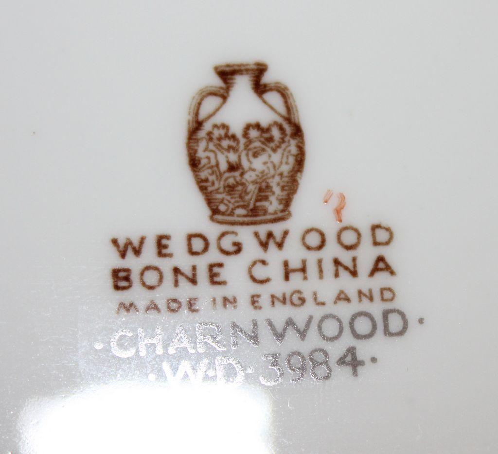 "Charnwood" china consisting of twelve dinner plates, twelve salad plates, eleven bread/butter, fifteen cups, seventeen saucers, platter, two serving bowls, eleven demi-tesse cups/ten saucers, two berry bowls, gravy, three bouillons, three saucers, total 101 pcs. "Charnwood" china consisting of twelve dinner plates, twelve salad plates, eleven bread/butter, fifteen cups, seventeen saucers, platter, two serving bowls, eleven demi-tesse cups/ten saucers, two berry bowls, gravy, three bouillons, three saucers, total 101 pcs.