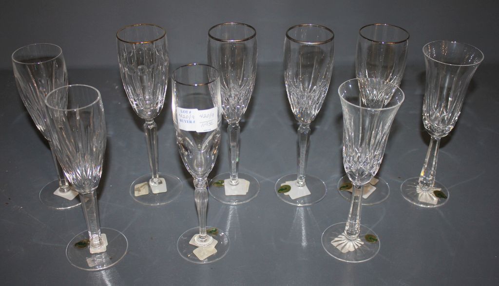 One Carleton Platinum flute 9"h., two Ballyshannon flutes 8"h, two carina flutes 8"h., three Wynnewood platinum flutes 9"h., one Grenville flute(gold rim) 9"h. One Carleton Platinum flute 9"h., two Ballyshannon flutes 8"h, two carina flutes 8"h., three Wynnewood platinum flutes 9"h., one Grenville flute(gold rim) 9"h.