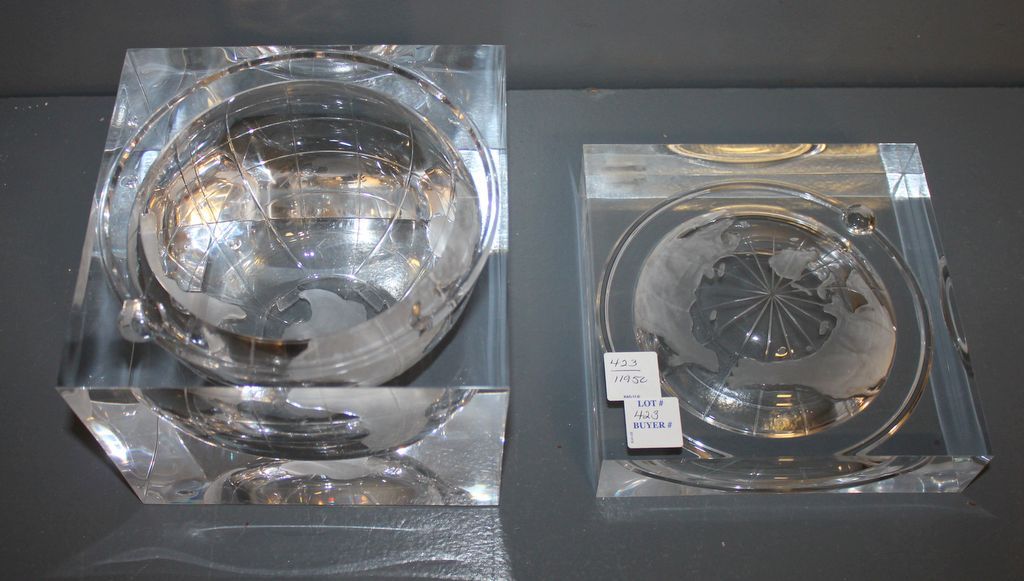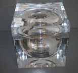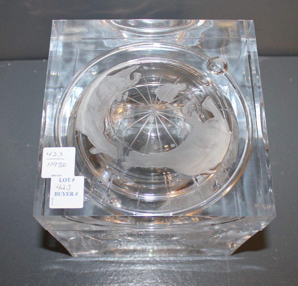 Square crystal ice bucket with etching of world 7"square. Square crystal ice bucket with etching of world 7"square.