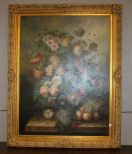 Large oil painting of flowers in gold frame, 45"w., 58"h. Large oil painting of flowers in gold frame, 45"w., 58"h.