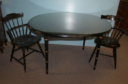 Twentieth century black lacquer breakfast table with oval shape glass top. Oriental motif, bamboo style legs ; Table, 51 1/2" w., 42" d., 30" h. Twentieth century black lacquer breakfast table with oval shape glass top. Oriental motif, bamboo style legs ; Table, 51 1/2" w., 42" d., 30" h.