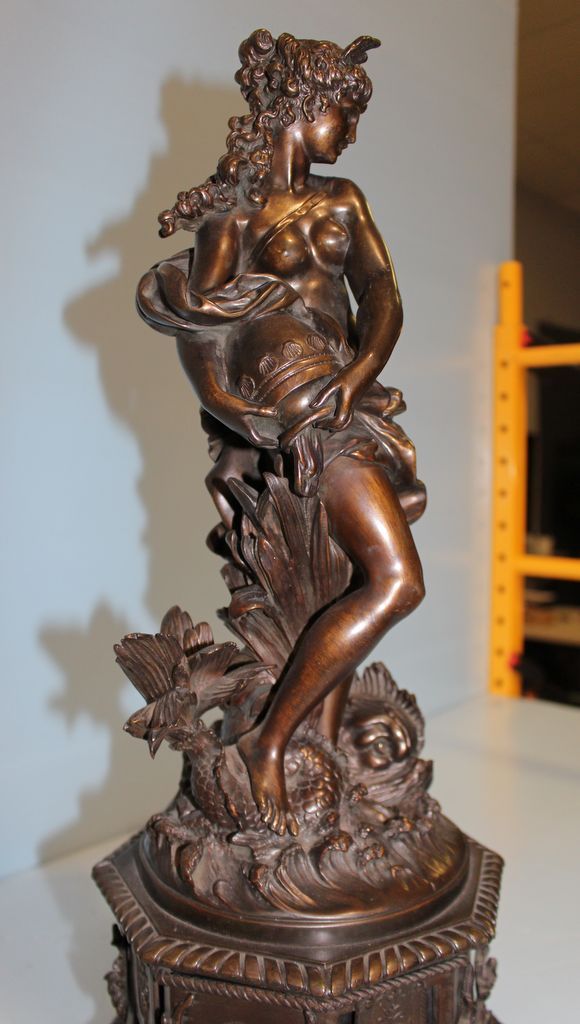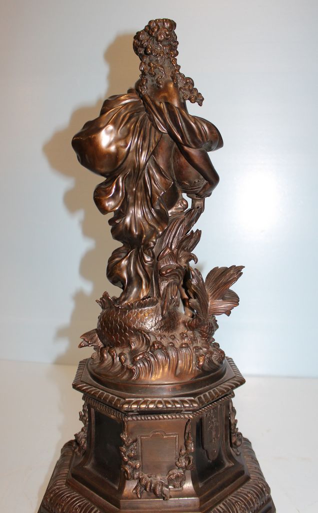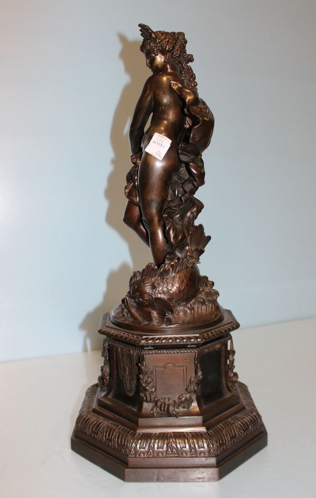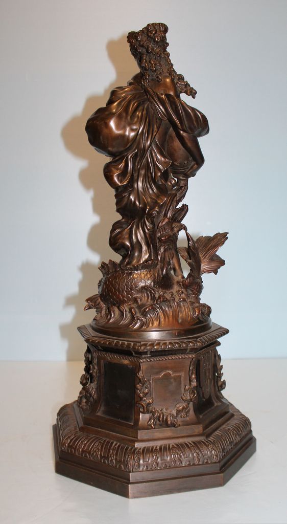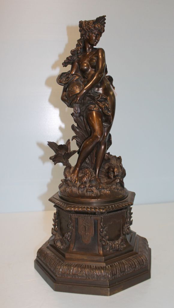 Greek Myth bronze of Amphitrite. Sea Goddess Amphitrite Sculpture standing on octagon shaped base with elaborate panels. Matches the bronze of Neptune; 28" h., 12" dia. Greek Myth bronze of Amphitrite. Sea Goddess Amphitrite Sculpture standing on octagon shaped base with elaborate panels. Matches the bronze of Neptune; 28" h., 12" dia.