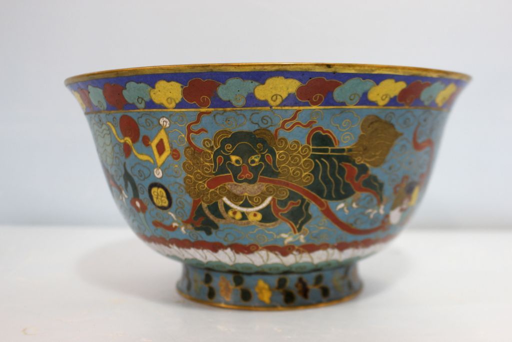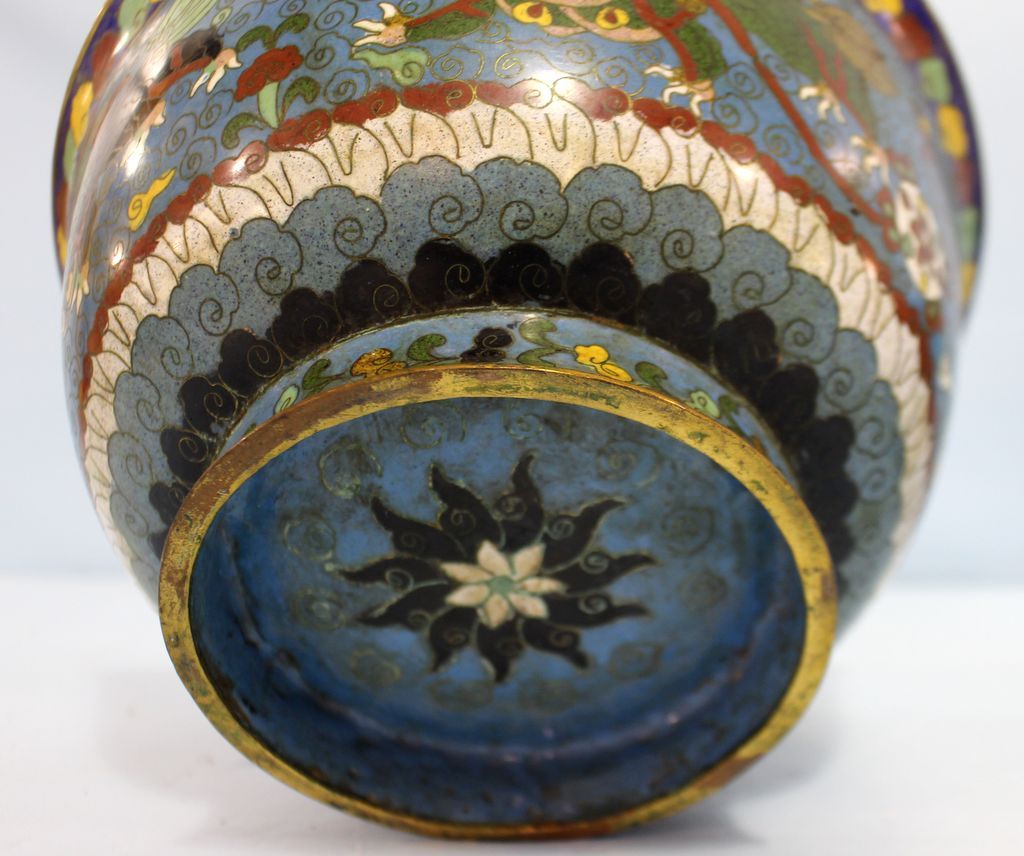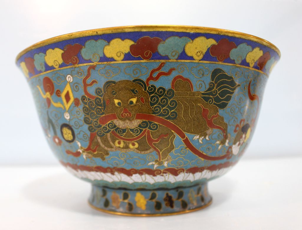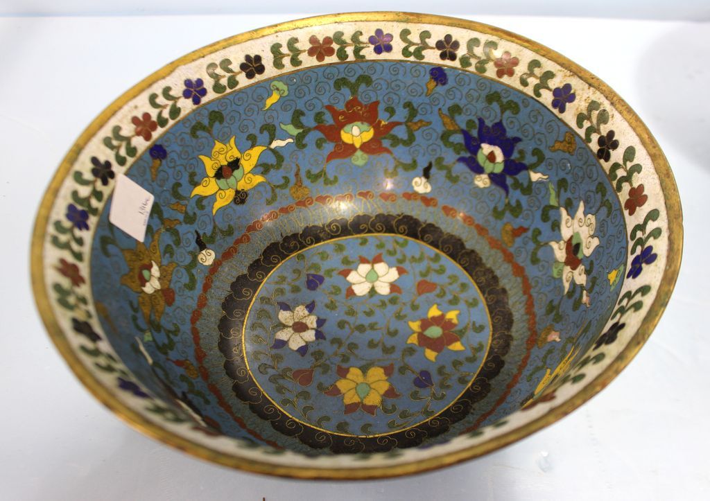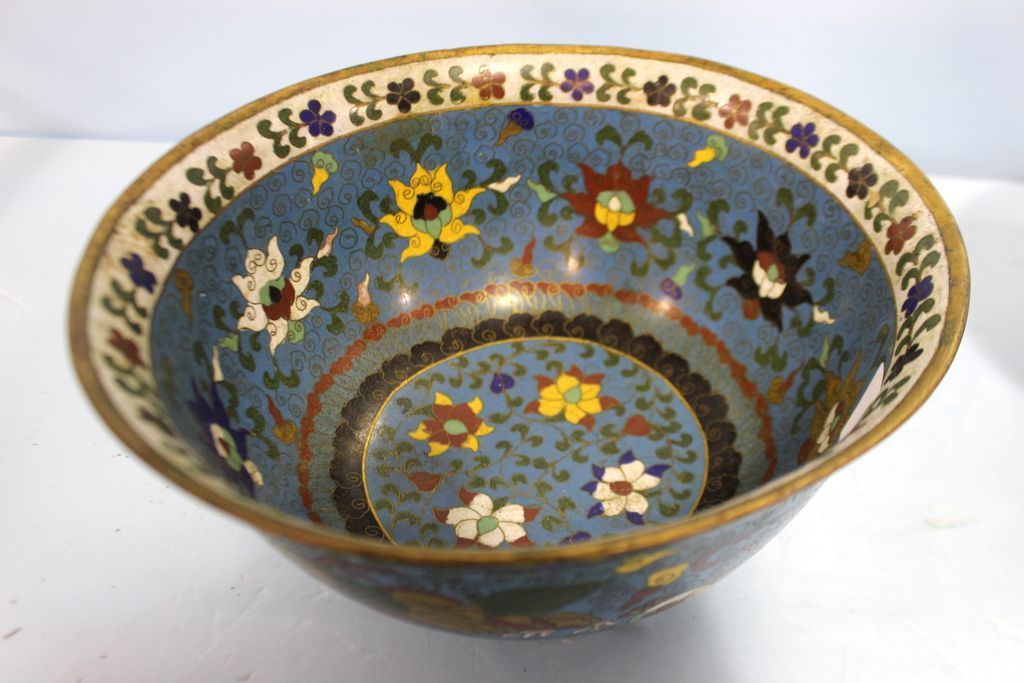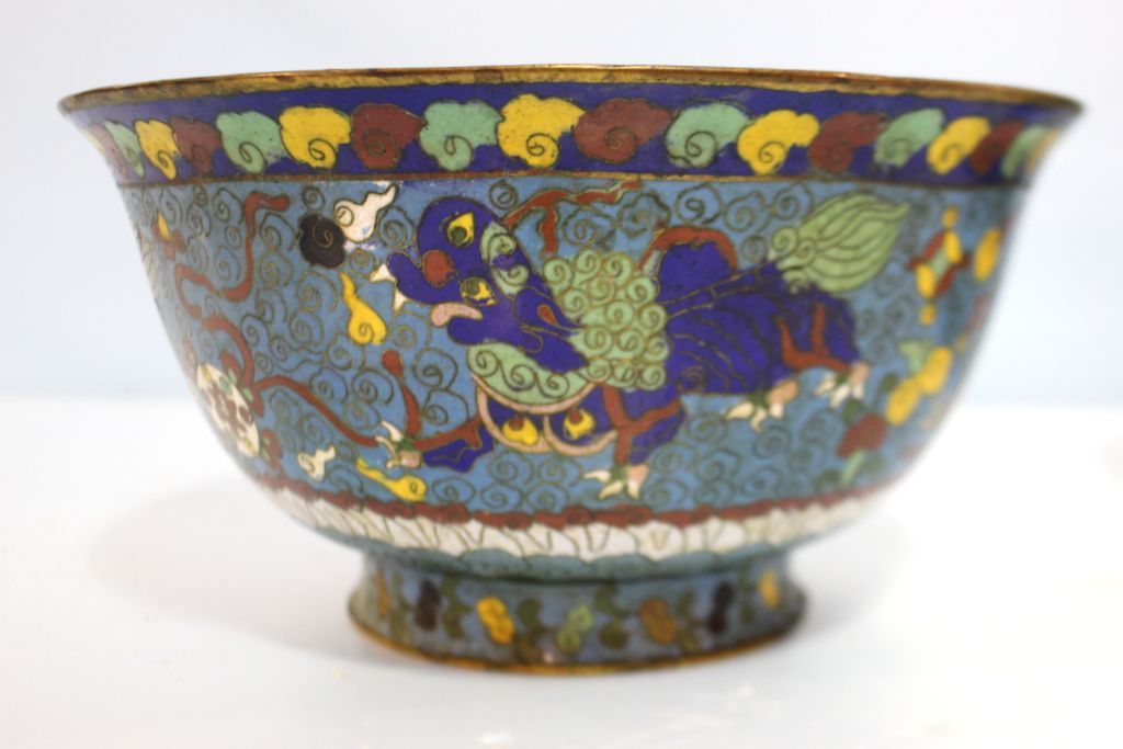 Unusual pair of Chinese cloisonne wedding bowls in blue ground decorated with flowers and dragons; 10" dia., 5 1/2" h. Unusual pair of Chinese cloisonne wedding bowls in blue ground decorated with flowers and dragons; 10" dia., 5 1/2" h.