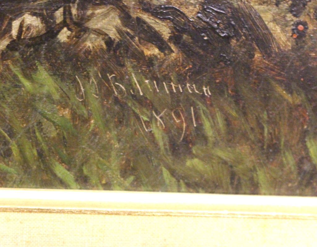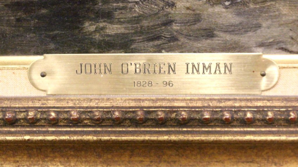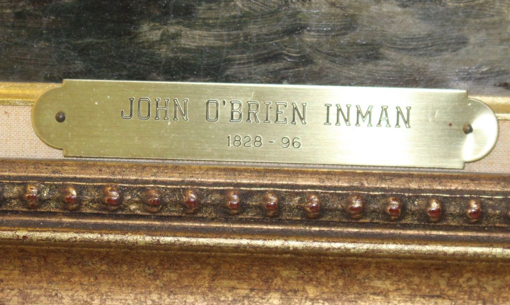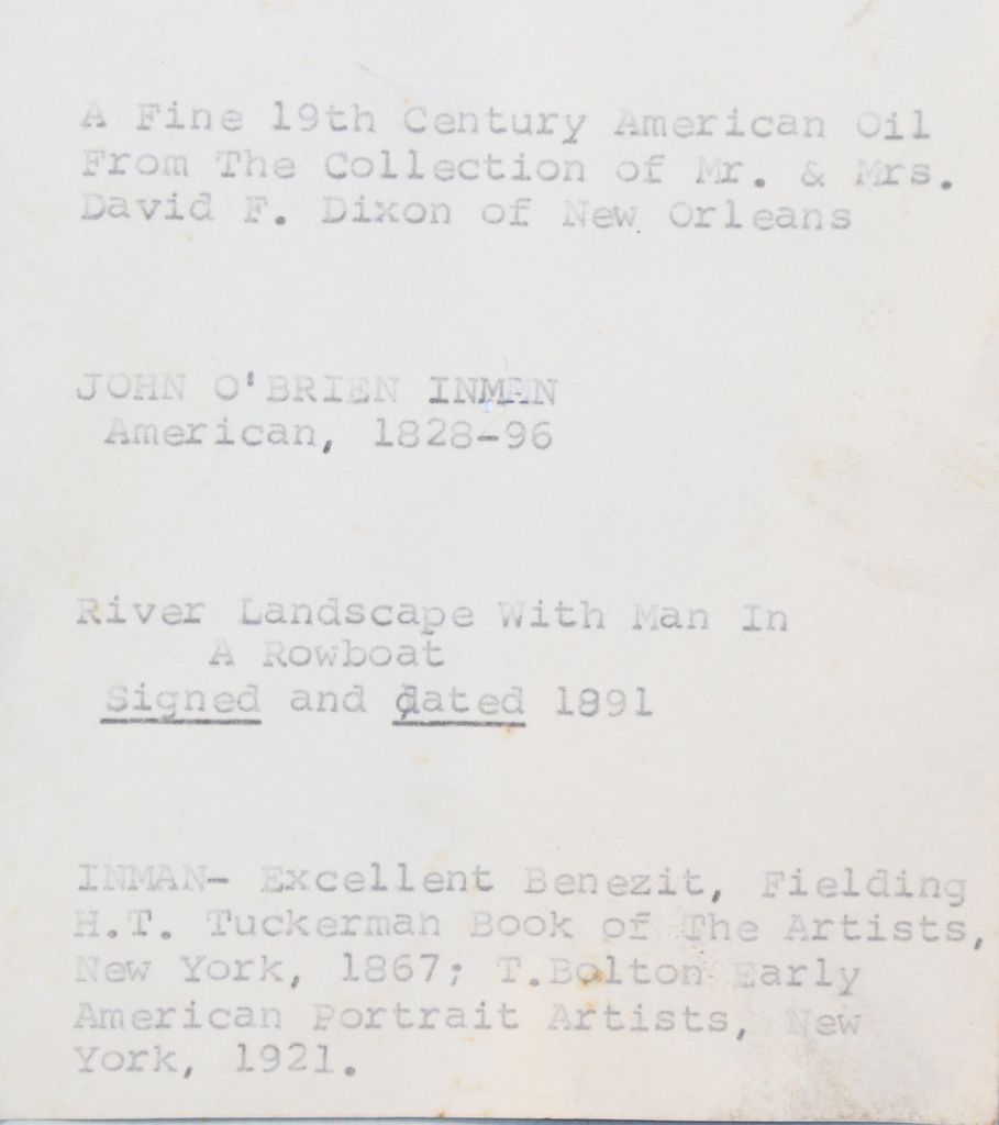 Oil painting of river landscape by John O' Brien Inman (American 1828-1896). John O'Brien Inman was born in New York in 1828, studied with his father (Henry Inman), and painted primarily portraits and seascapes; 25" w., 15" h. Oil painting of river landscape by John O' Brien Inman (American 1828-1896). John O'Brien Inman was born in New York in 1828, studied with his father (Henry Inman), and painted primarily portraits and seascapes; 25" w., 15" h.