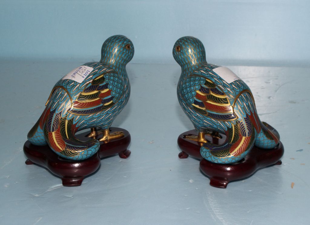 155 Rare Pair of Chinese Cloisonne Quail Incense Burners