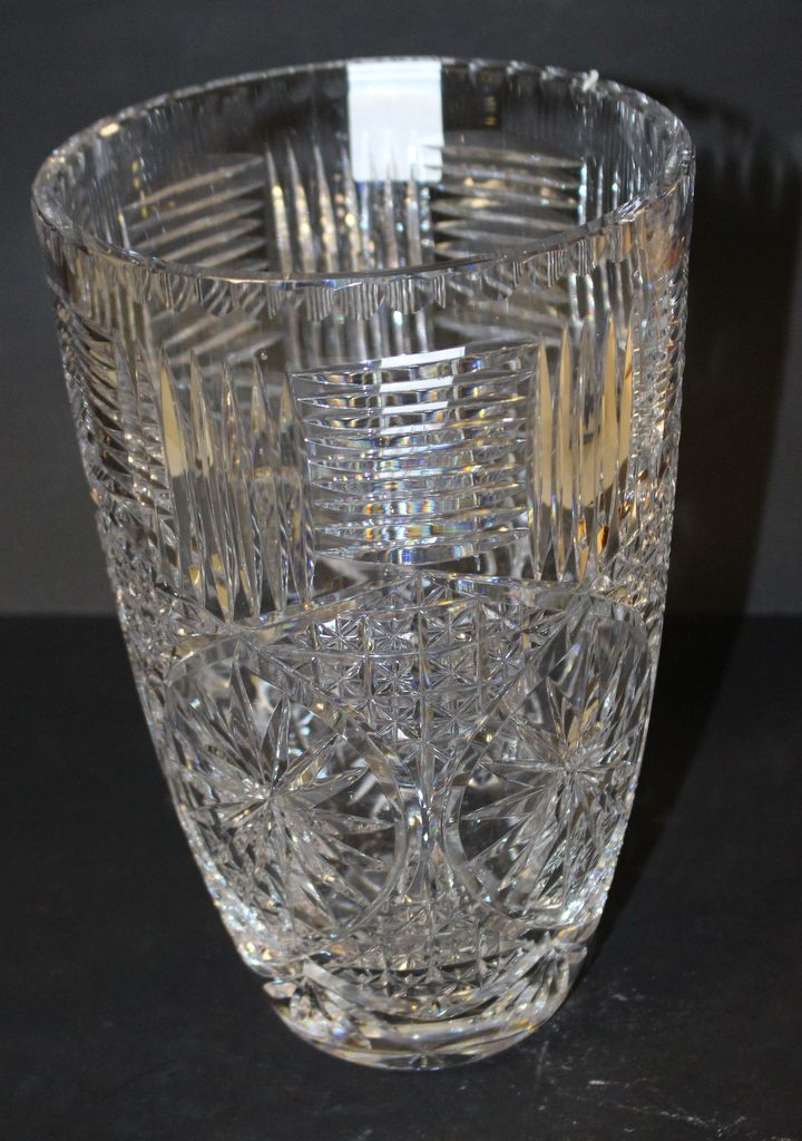 Large hand cut glass crystal vase with stars and diamonds; 10" h. Large hand cut glass crystal vase with stars and diamonds; 10" h.