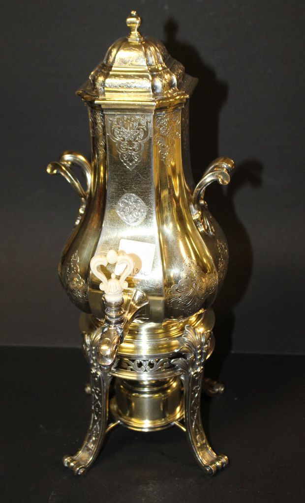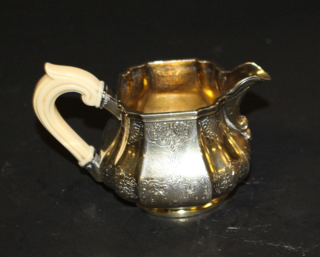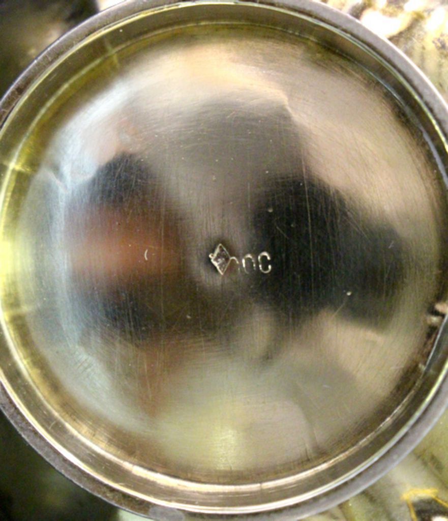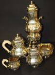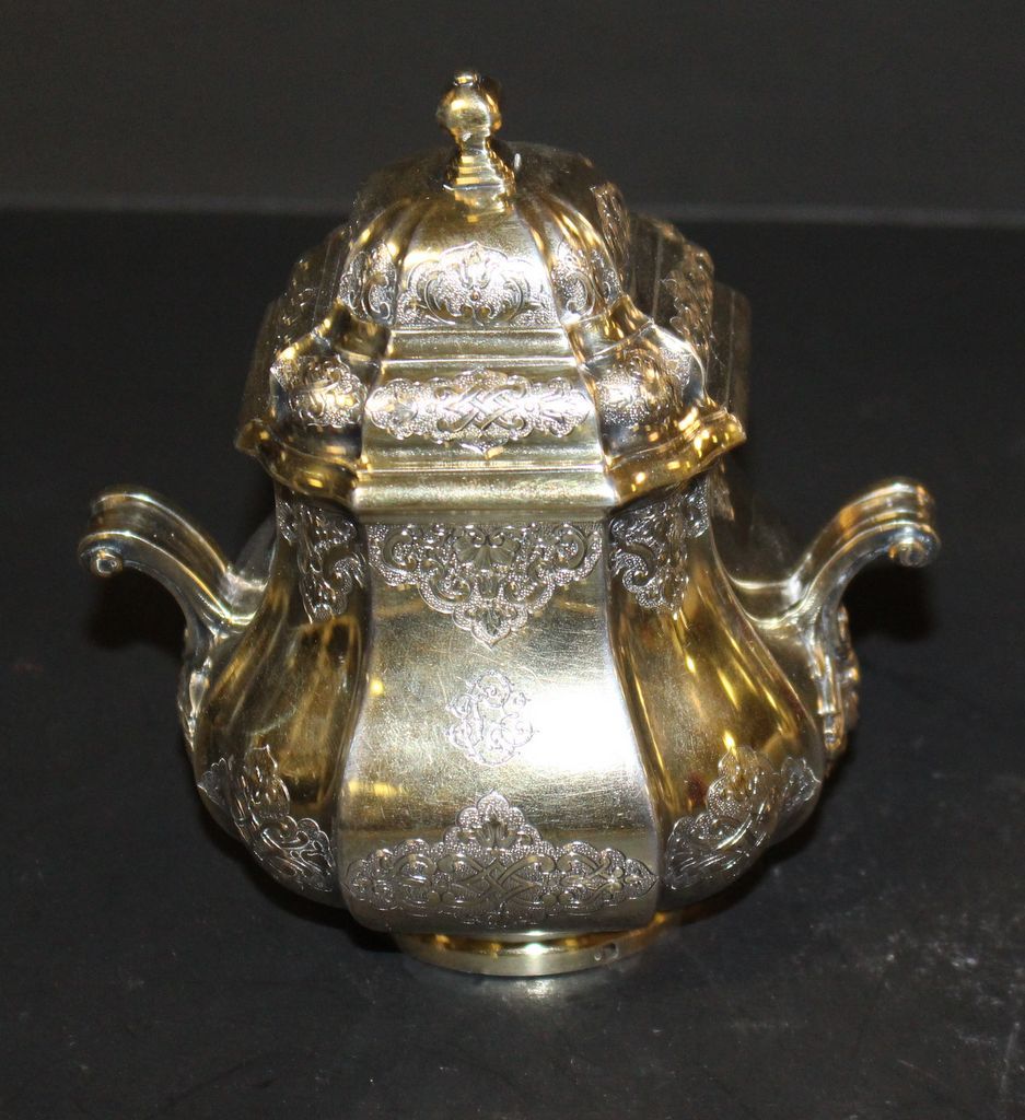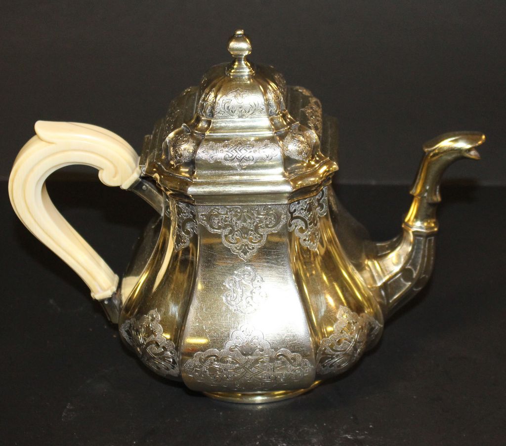 Nineteenth century silver French tea set marked A. Aucoc, Paris. Tea set bears the mark of A. Aucoc, Paris, late 19th century; Tea pot on stand, pot (bone handle), sugar, creamer, open waste. Designs etched with acid. 1887-1911 Nineteenth century silver French tea set marked A. Aucoc, Paris. Tea set bears the mark of A. Aucoc, Paris, late 19th century; Tea pot on stand, pot (bone handle), sugar, creamer, open waste. Designs etched with acid. 1887-1911