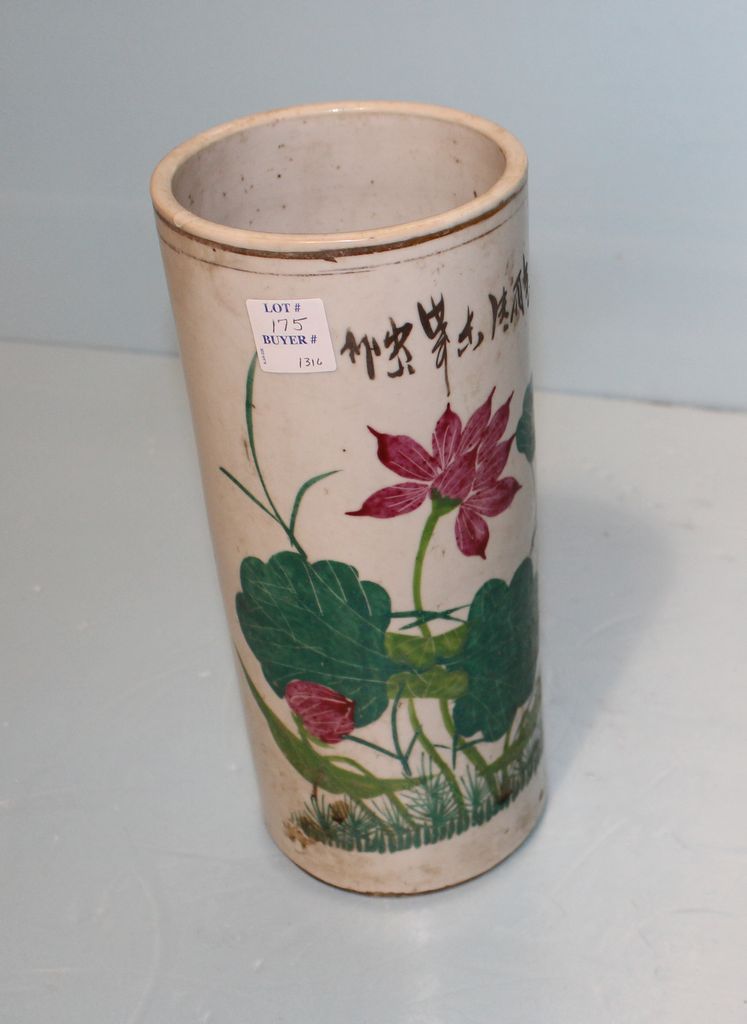 Porcelain hand painted Chinese Wig Stand with lotus flower design; 5" dia., 11" h. Porcelain hand painted Chinese Wig Stand with lotus flower design; 5" dia., 11" h.