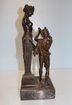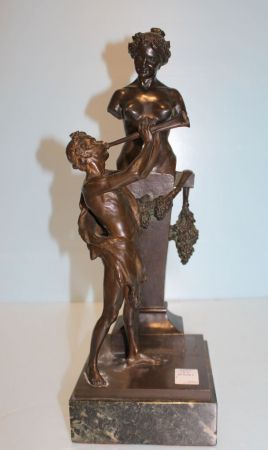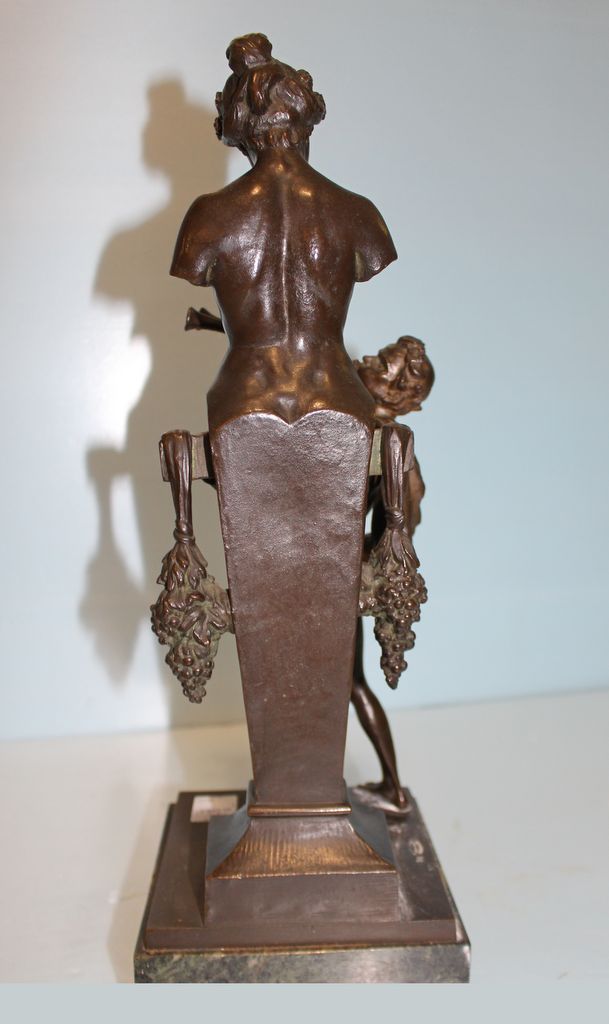 "Pleasing the Wine Goddess" , flutist, bust of Goddess on marble base, stamped 38 Wiener Gesellscraft Von Feunden der Kleinplastiken (Vienna) signed Joh. Benk (Johannes Benk, Vienna 1844-1914) ; 18" h., 6" w., 6 1/2" dia. "Pleasing the Wine Goddess" , flutist, bust of Goddess on marble base, stamped 38 Wiener Gesellscraft Von Feunden der Kleinplastiken (Vienna) signed Joh. Benk (Johannes Benk, Vienna 1844-1914) ; 18" h., 6" w., 6 1/2" dia.