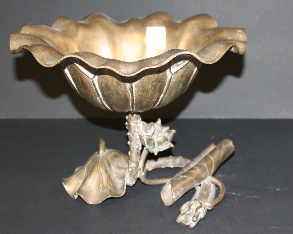 Nineteenth century Art Nouveaux bronze centerpiece or scallop fruit bowl on a lily pad base. Bowl is detached from base; 11 7/8" dia., 9"h. Nineteenth century Art Nouveaux bronze centerpiece or scallop fruit bowl on a lily pad base. Bowl is detached from base; 11 7/8" dia., 9"h.
