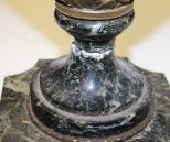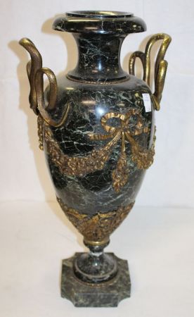 Large green marble and bronze urn with snake handles. Bodice is decorated with swags, marble broken around base of urn; 24" h. Large green marble and bronze urn with snake handles. Bodice is decorated with swags, marble broken around base of urn; 24" h.