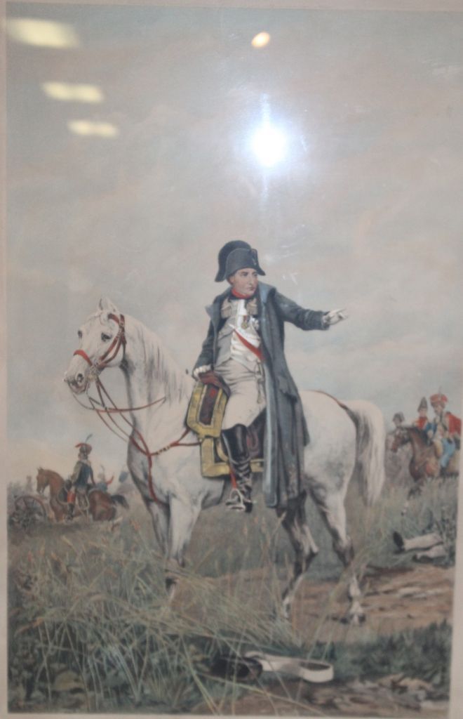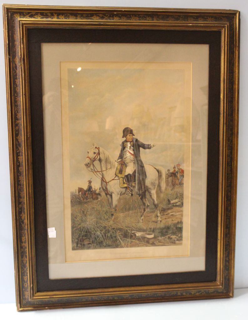 Nineteenth century large hand colored lithograph of Napoleon entitled "Napoleon Watching the Old Guard at Waterloo", 1815, signed lower right (Laslett John Pott, 1837-1898). In appropriate antique frame which has stenciled border; 25" w., 28" h. Nineteenth century large hand colored lithograph of Napoleon entitled "Napoleon Watching the Old Guard at Waterloo", 1815, signed lower right (Laslett John Pott, 1837-1898). In appropriate antique frame which has stenciled border; 25" w., 28" h.