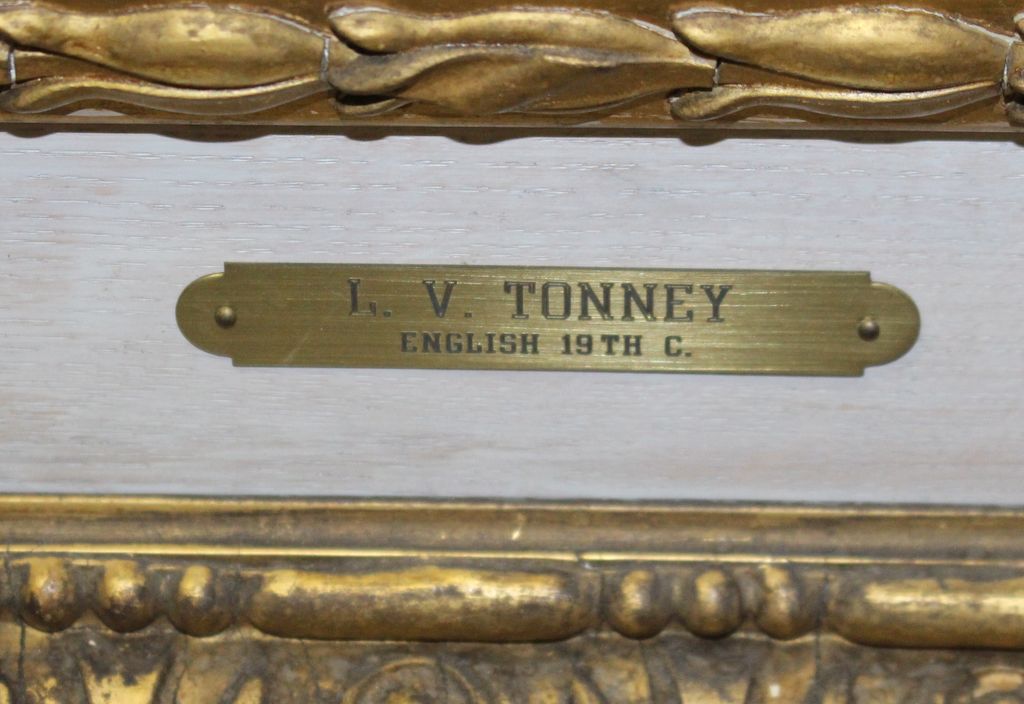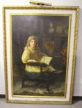 Large oil on canvas of a young lady reading. Portrait of Alice Evelyn McKee (Scottish). Has plaque bearing the name V.L. Tonney. Back side is written Y.L. Tonney; 51" w., 72" h. Large oil on canvas of a young lady reading. Portrait of Alice Evelyn McKee (Scottish). Has plaque bearing the name V.L. Tonney. Back side is written Y.L. Tonney; 51" w., 72" h.
