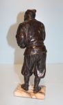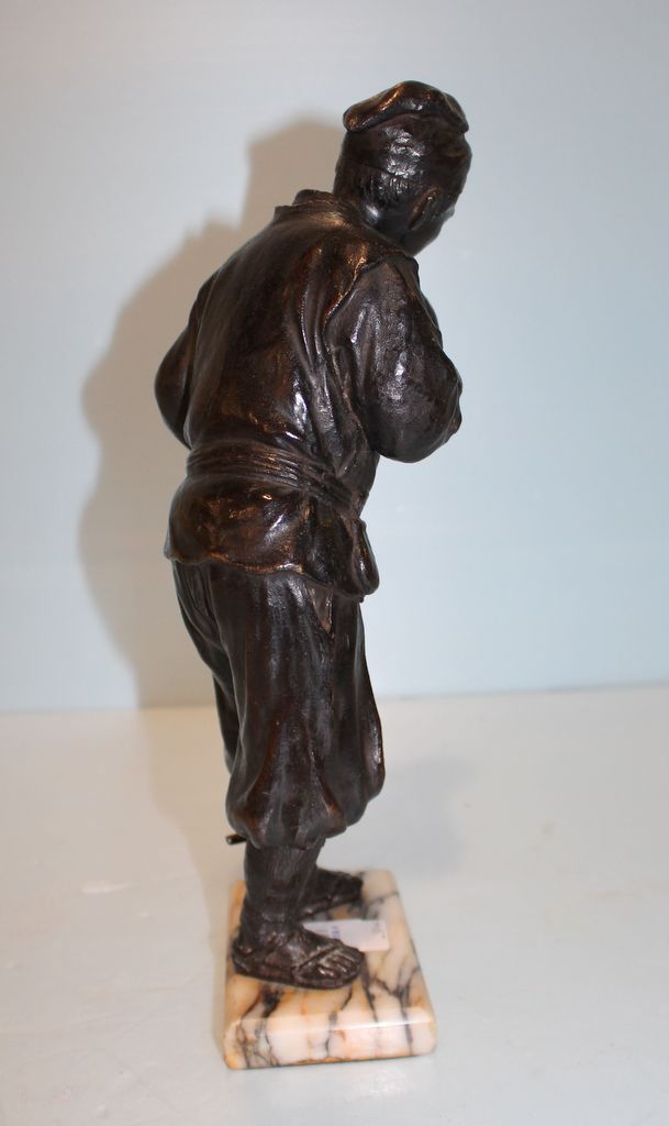 Unusual Budapest bronze of a Chinese man carrying a bottle, on marble base (chip on base); 14 1/2" h., 5" w., 3 1/2" dia. Unusual Budapest bronze of a Chinese man carrying a bottle, on marble base (chip on base); 14 1/2" h., 5" w., 3 1/2" dia.
