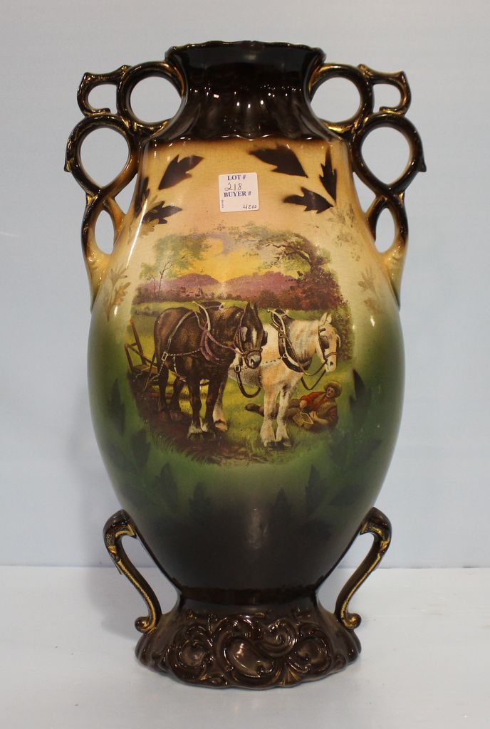 Large early twentieth century English vase with transfer print of horses hitched to a plow; 19" h., 10" w. Large early twentieth century English vase with transfer print of horses hitched to a plow; 19" h., 10" w.