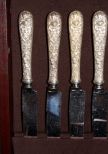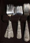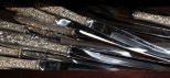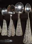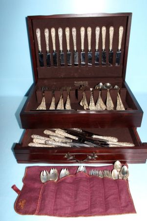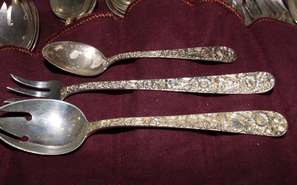 Several elaborate flatware patterns by Kirk Stieff. These are repousse sterling S. Kirk & Sons. Twelve dinner forks, eleven salad forks, eleven teaspoons, eight 5 1/4" spoon (bouillon) and other pattern repousse Kirk set of twelve cream soup spoons, another pattern set of sixteen steak knives, different pattern set of thirteen dinner knives, another repousse pattern consisting of ten butter knives, eight ice tea spoons, twelve fruit spoons, twelve cocktail forks, thirteen demitasse spoons; 138 pieces total. Approx. 110.49 ozt. Circa. 1828 Pattern. Several elaborate flatware patterns by Kirk Stieff. These are repousse sterling S. Kirk & Sons. Twelve dinner forks, eleven salad forks, eleven teaspoons, eight 5 1/4" spoon (bouillon) and other pattern repousse Kirk set of twelve cream soup spoons, another pattern set of sixteen steak knives, different pattern set of thirteen dinner knives, another repousse pattern consisting of ten butter knives, eight ice tea spoons, twelve fruit spoons, twelve cocktail forks, thirteen demitasse spoons; 138 pieces total. Approx. 110.49 ozt. Circa. 1828 Pattern.