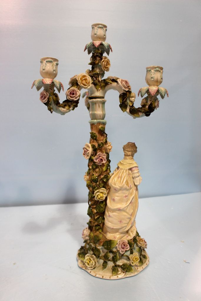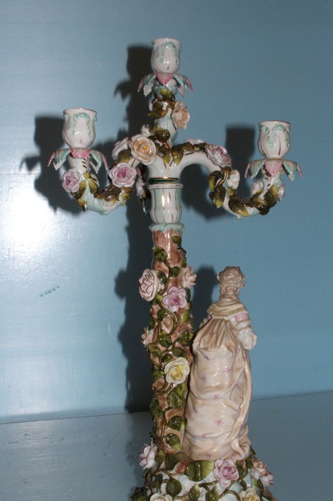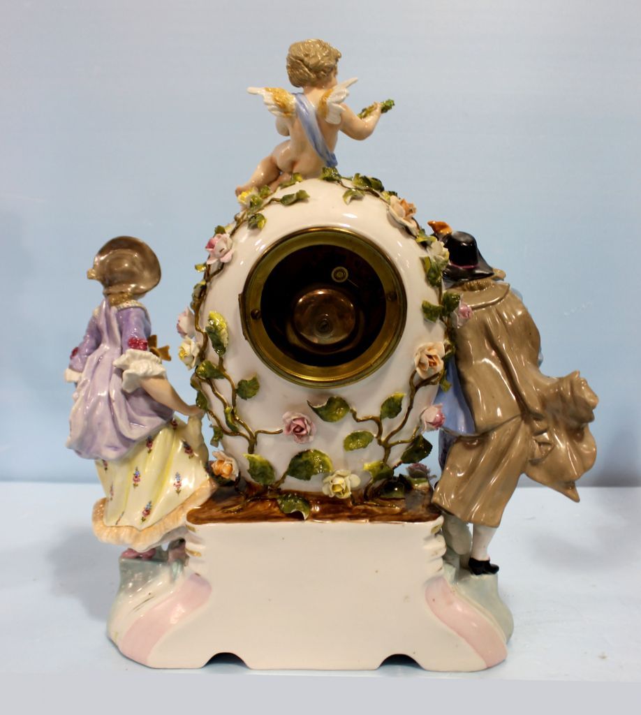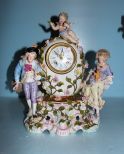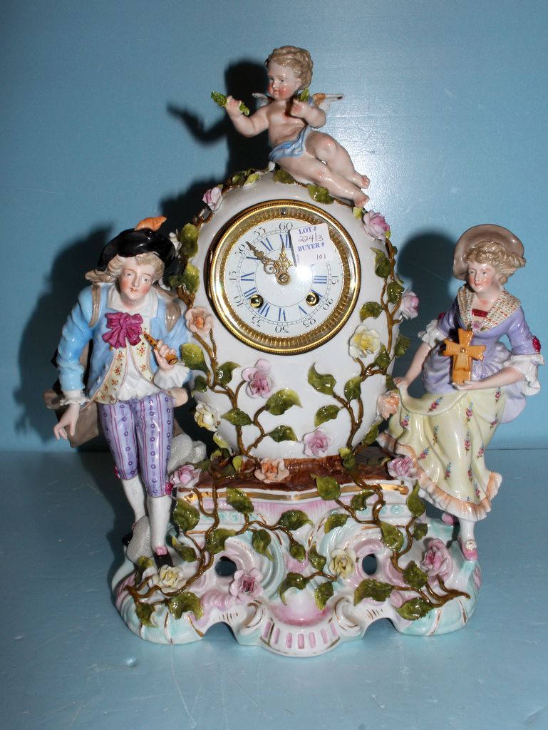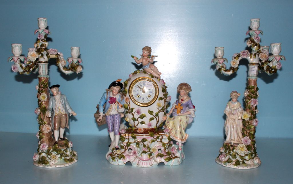 Pair porcelain figural candelabras and clock. Three piece porcelain clock set with figural candlesticks. This is a high style Dresden (crossed lines) clock set with cupids, roses and figurines. Clock, 11" w., 17" h. ; candlesticks, 12" w., 23" h. Pair porcelain figural candelabras and clock. Three piece porcelain clock set with figural candlesticks. This is a high style Dresden (crossed lines) clock set with cupids, roses and figurines. Clock, 11" w., 17" h. ; candlesticks, 12" w., 23" h.