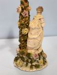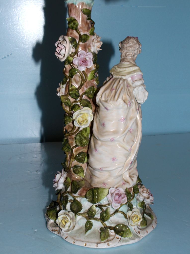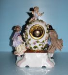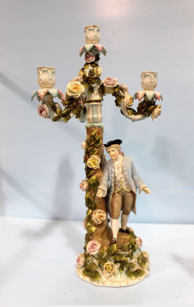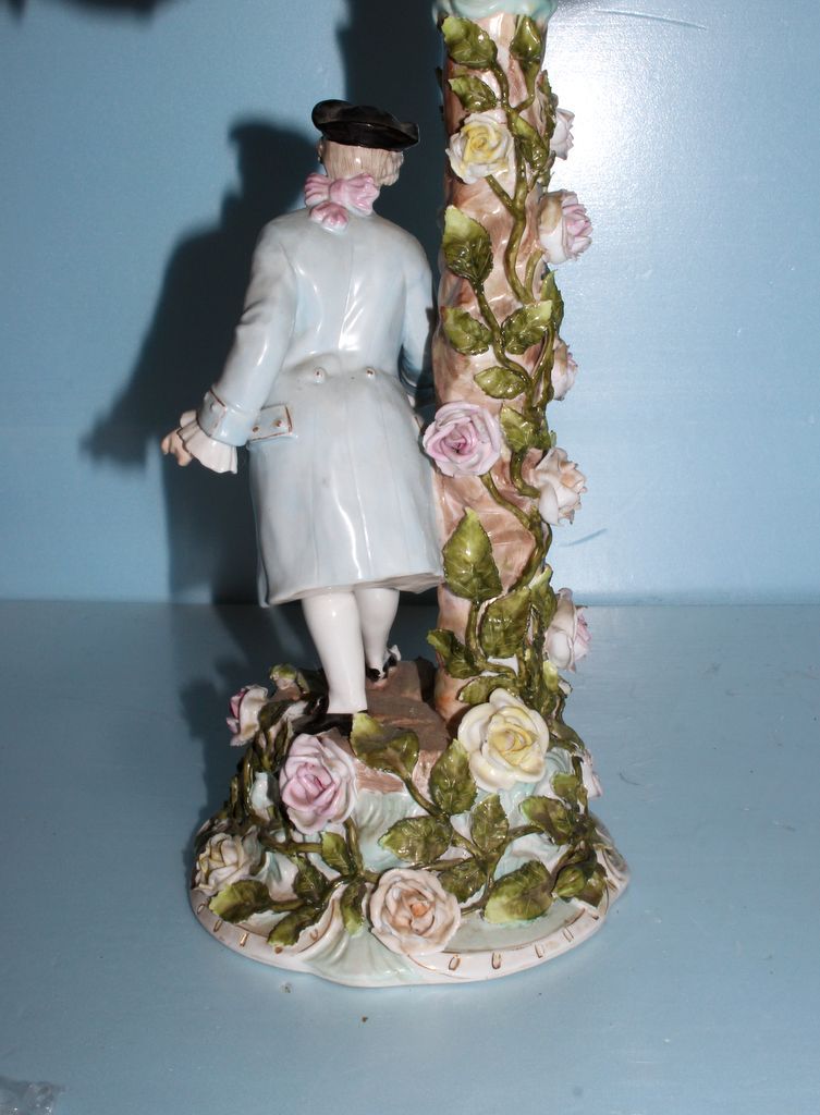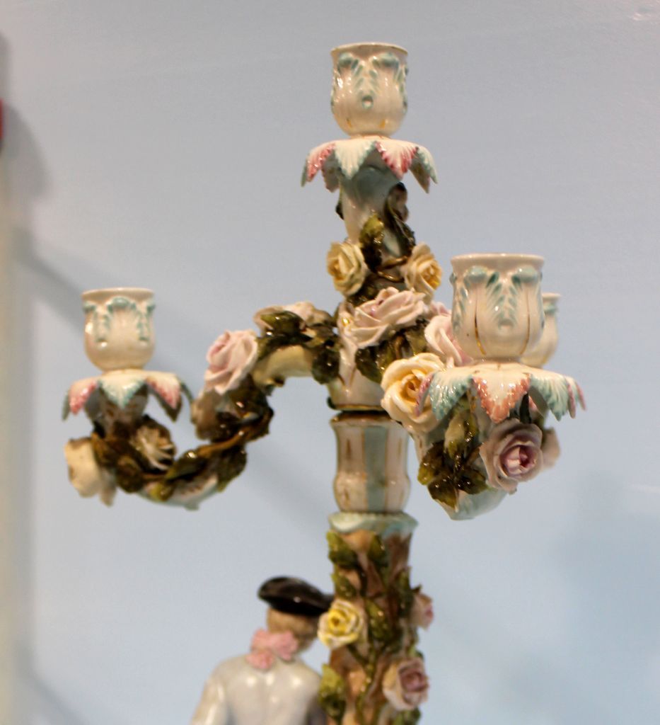 Pair porcelain figural candelabras and clock. Three piece porcelain clock set with figural candlesticks. This is a high style Dresden (crossed lines) clock set with cupids, roses and figurines. Clock, 11" w., 17" h. ; candlesticks, 12" w., 23" h. Pair porcelain figural candelabras and clock. Three piece porcelain clock set with figural candlesticks. This is a high style Dresden (crossed lines) clock set with cupids, roses and figurines. Clock, 11" w., 17" h. ; candlesticks, 12" w., 23" h.
