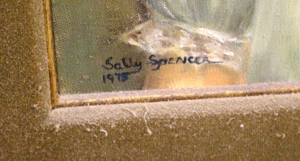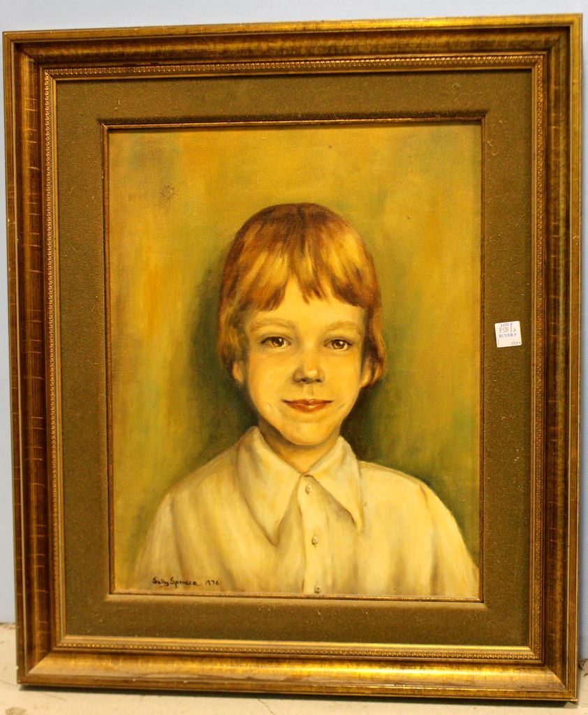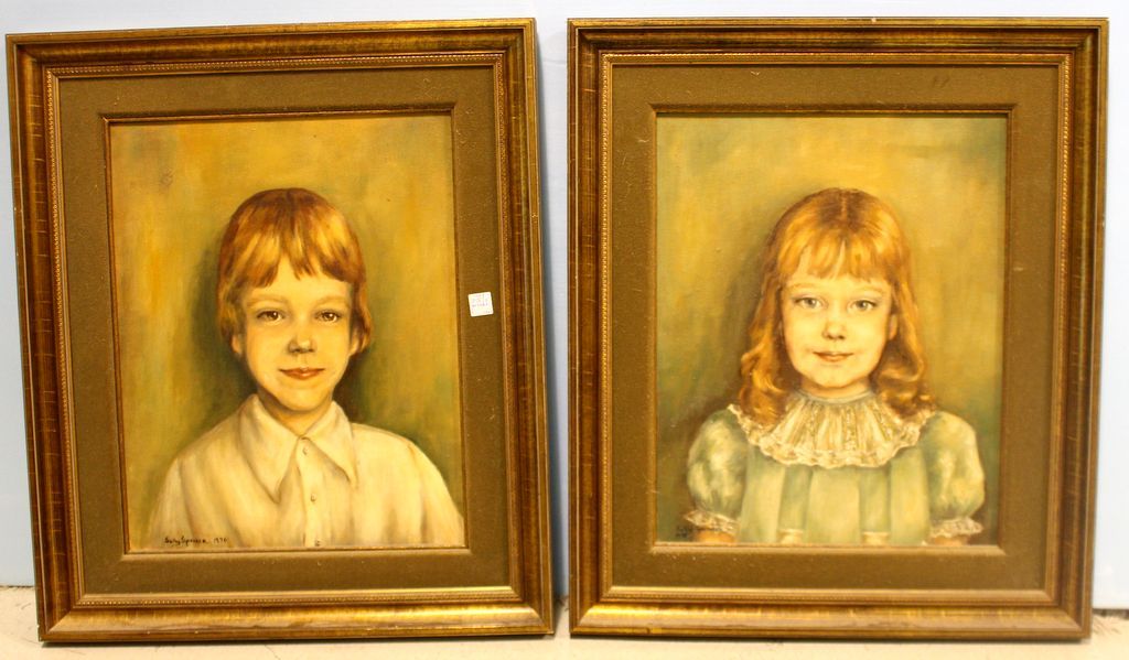 Pair of Oil paintings of young boy and girl each signed and dated Sally Spencer (1976). Sally Spencer is a Mississippi artist whose early commissions included children of prominent state senators. 23 1/2" w., 28" h. Pair of Oil paintings of young boy and girl each signed and dated Sally Spencer (1976). Sally Spencer is a Mississippi artist whose early commissions included children of prominent state senators. 23 1/2" w., 28" h.